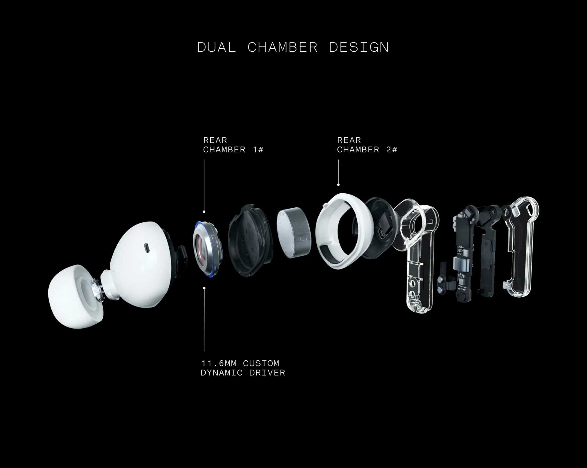 Un nuevo diseño de doble cámara y nuestro 11,6mm dinámico El controlador garantiza que la reproducción revele cada detalle. Transportándote al estudio de grabación, estés donde estés.